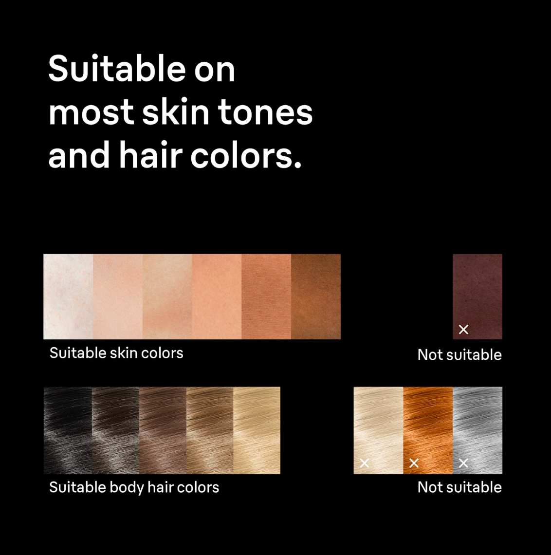 For lighter hair or medium-to-darker skin, use the lower power settings and always complete the included Skin Safety Test before starting treatment.