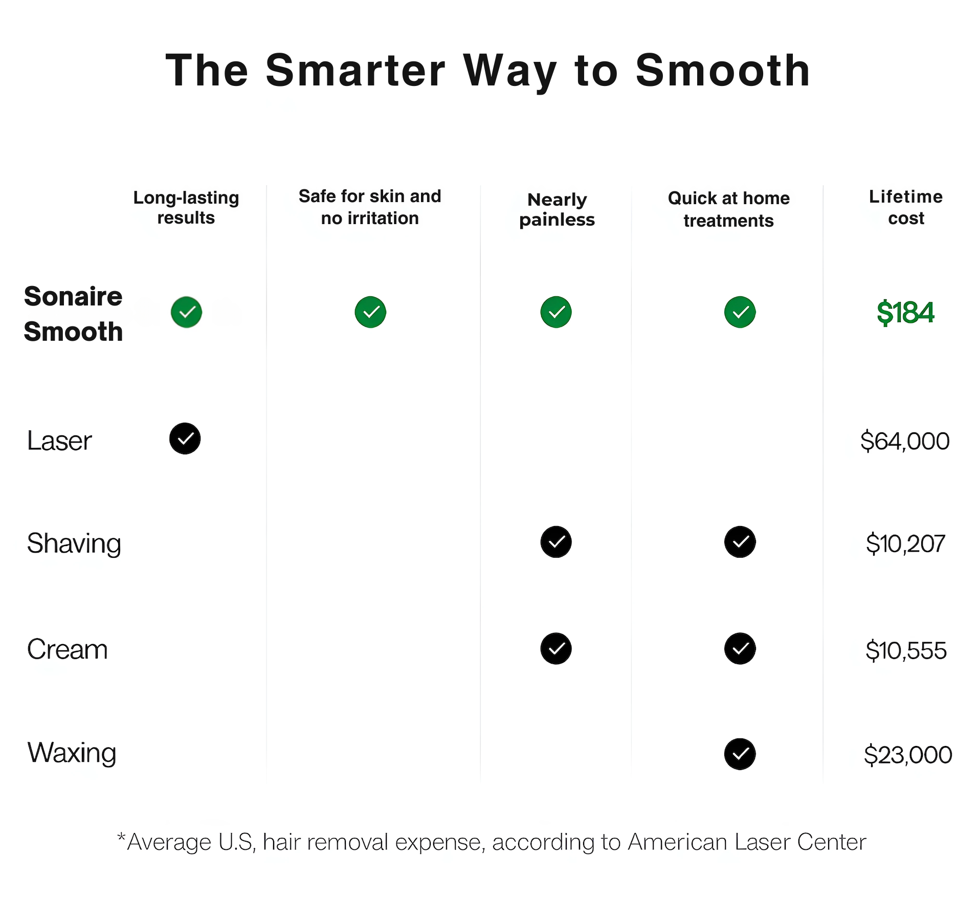With Sonaire Smooth, you can achieve professional-grade results at home without the cost or discomfort of in-clinic laser treatments.